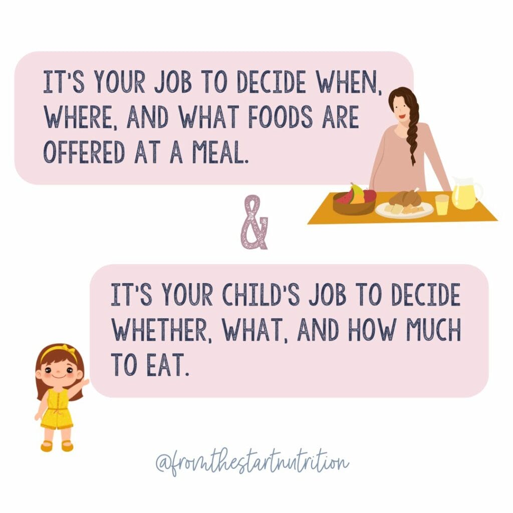 The Division of Responsibility in Feeding (sDOR) was developed by Ellyn Satter, a Registered Dietitian and Family Therapist who specializes in child feeding. The sDOR is based on the idea that as parents, we are responsible for what, when, and where our children eat, while our children are responsible for how much and whether to eat. This approach may sound simple, but it often challenges common parenting instincts. For many parents, implementing the Division of Responsibility requires a conscious effort and practice, as it doesn’t always come naturally.For example, many parents often fall into the trap of trying to control how much or what our children eat. We may coerce them into finishing their plate or only let them eat dessert if they eat food options that we deem as “healthy.” However, this can lead to power struggles and hinder our children from developing a positive relationship with food. By following the sDOR, we give our children autonomy over mealtimes which empowers them to learn how to make their own food choices and listen to their hunger and fullness cues, ultimately helping them learn how to self-regulate their eating habits. After all, lifelong, independent eaters is our long-term goal. It’s important to note that the sDOR is not a strict set of rules, but rather a flexible framework that allows for individual differences in appetite and preferences. As parents, we still have control over what types of food are offered and when meals and snacks are served.